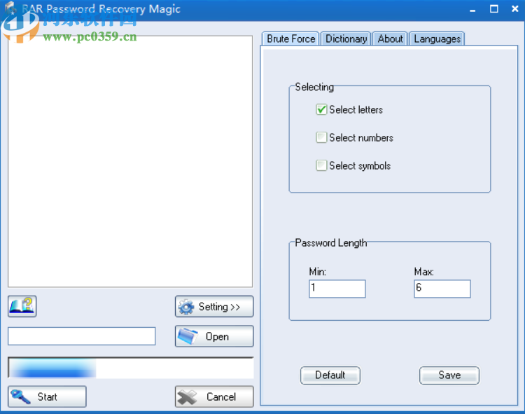 3.点击打开按钮之后下一步就是需要在界面的右边设置密码的相关参数,在暴力破解这个界面中点击选择字母、数字、符号。