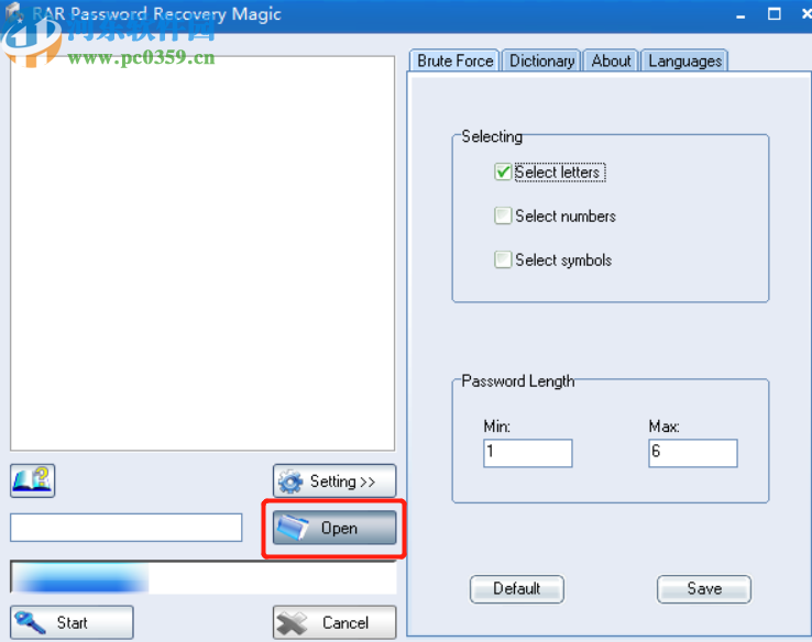 1.首先第一步我们打开软件之后在软件的主界面中点击Open这个功能按钮,点击之后可以添加要恢复密码的RAR文件。