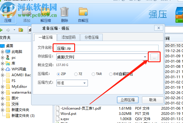 2.点击压缩之后就会打开配置压缩文件的界面了,在这个界面中我们可以输入压缩文件的名称,然后点击存放路径选项后面的三点按钮可以更改存放路径。