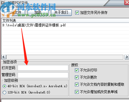 4.根据需求输入密码之后,在界面中还可以对加密级别和授权进行选择,授权就是打开文件之后是否可以打印、更改等,用户根据需求设置勾选即可。