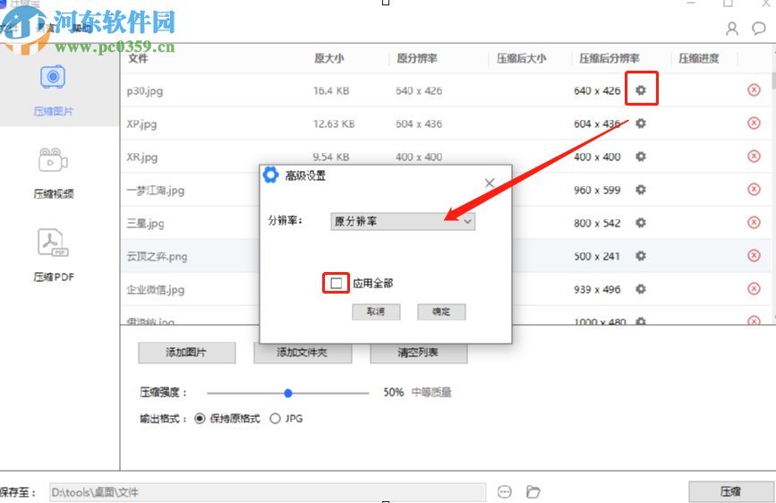 3.点击确定按钮之后软件会自动识别在这个文件夹中有哪些图片文件,识别完成之后我们在列表选项中点击齿轮图标,点击这个齿轮图标可以打开图片的分辨率设置界面,选择想要的分辨率之后可以勾选应用到全部图片中。