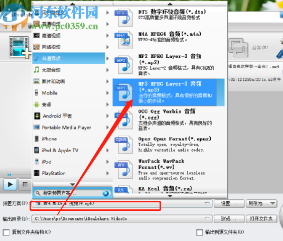 3.点击打开按钮将视频添加到软件之后,我们点击预置方案即可打开选择转换格式的界面,然后我们在其中找到音频格式,选择自己想要的音频格式即可。