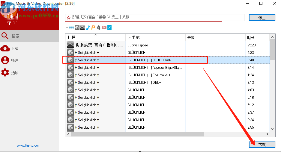 4.回到搜索界面之后我们就可以看到搜索出来的一些音乐文件了,然后我们点击想要下载的那一条音乐信息,点击右下角的下载按钮即可。