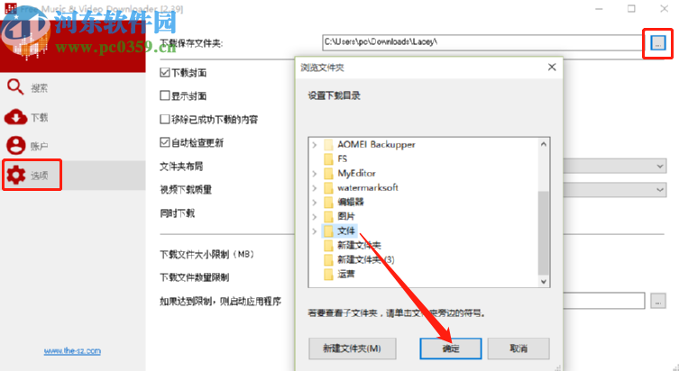 3.在搜索的这段时间我们可以点击左边的选项按钮切换到选项设置界面,点击下载保存文件夹右边的三点按钮可以选择文件下载之后保存的文件夹位置,这样方便我们找到下载好的音乐文件。