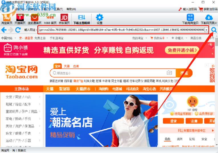1.首先第一步我们打开软件之后将想要下载主图视频的淘宝商品链接复制到地址栏中,然后点击右边的搜索图标。