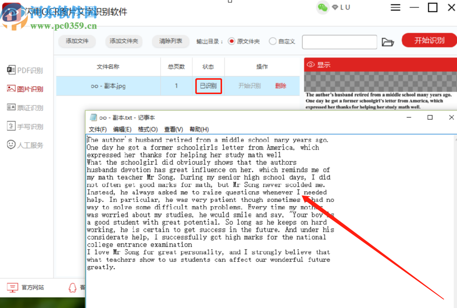 6.最后等到识别操作完成,状态这一栏显示已识别之后,就会自动打开识别结果保存的文件了,我们就可以看到识别出来的文字内容了。