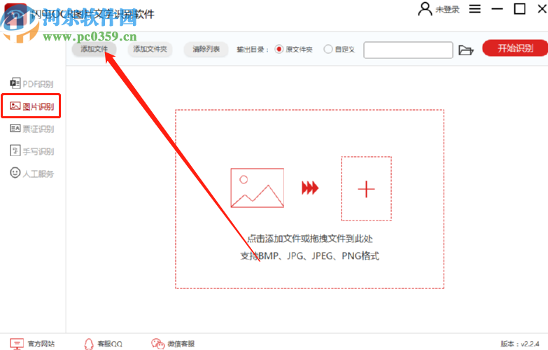 1.首先第一步我们打开软件之后在界面左边点击图片识别这个功能选项,点击之后在图片识别功能中点击添加文件按钮,或者直接拖拽需要识别的图片到界面中。