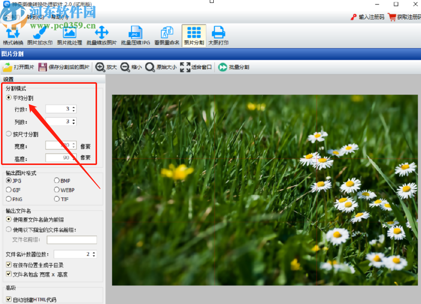 3.点击打开按钮之后选择的图片就添加到软件界面中了,然后我们点击界面左边分割模式的位置可以选择想要分割图片的模式,平均分割的话需要输入分割的行数和列数。