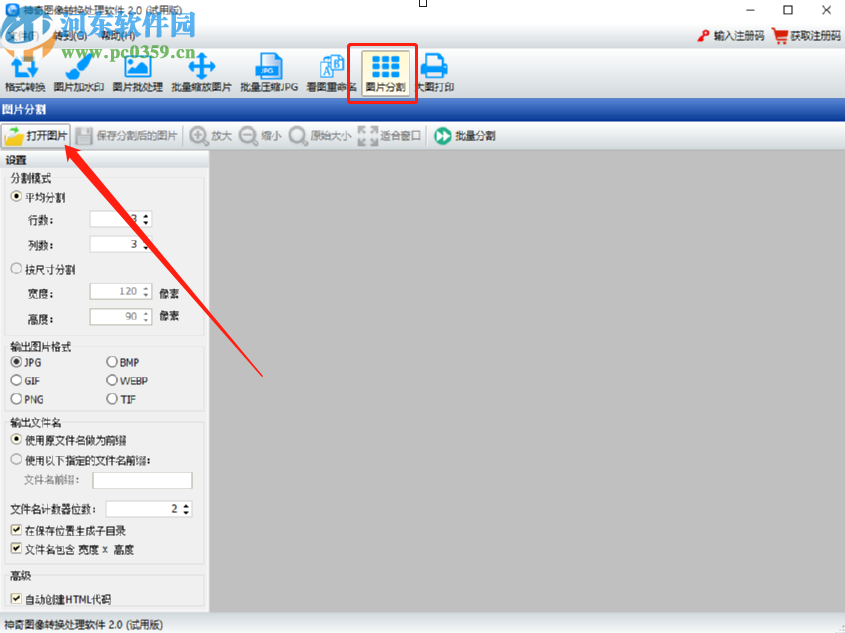 1.首先第一步我们打开软件之后在软件界面上方点击图片分割这个功能,点击之后在出现的界面左上方点击打开图片这个功能选项。