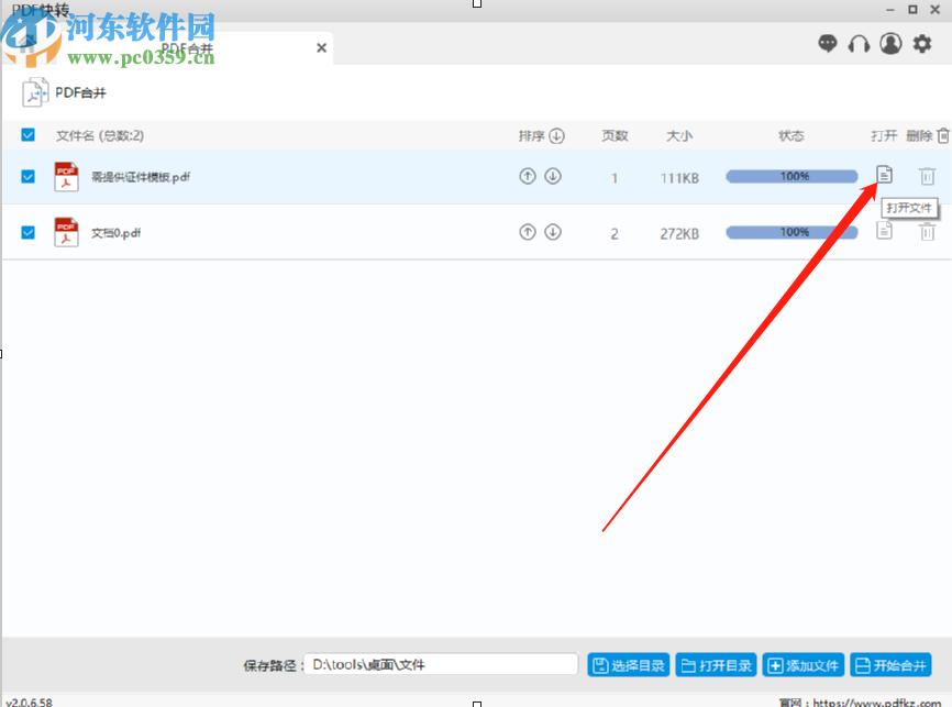 6.最后等到合并操作完成之后我们在界面中可以看到状态为100%,然后我们点击打开选项下面的文件夹图标即可查看合并的文件。