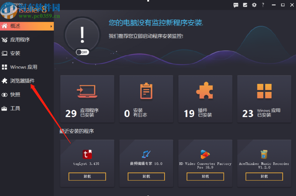 1.首先第一步我们打开软件之后在软件界面左边就可以看到浏览器插件这个功能,然后我们点击进入到其中。