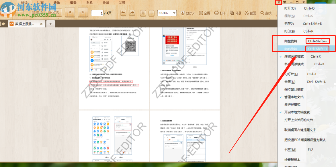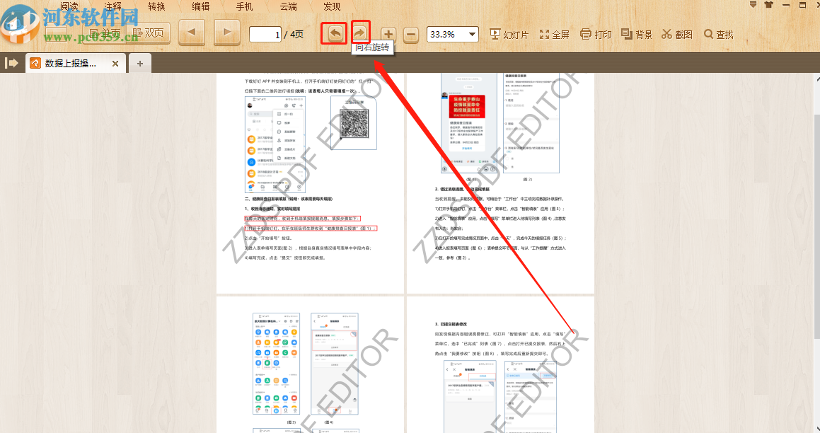 3.点击这个打开按钮之后下一步我们就可以在阅读PDF文件的界面上方看到选中功能图标了,有向左旋转和向右旋转功能。