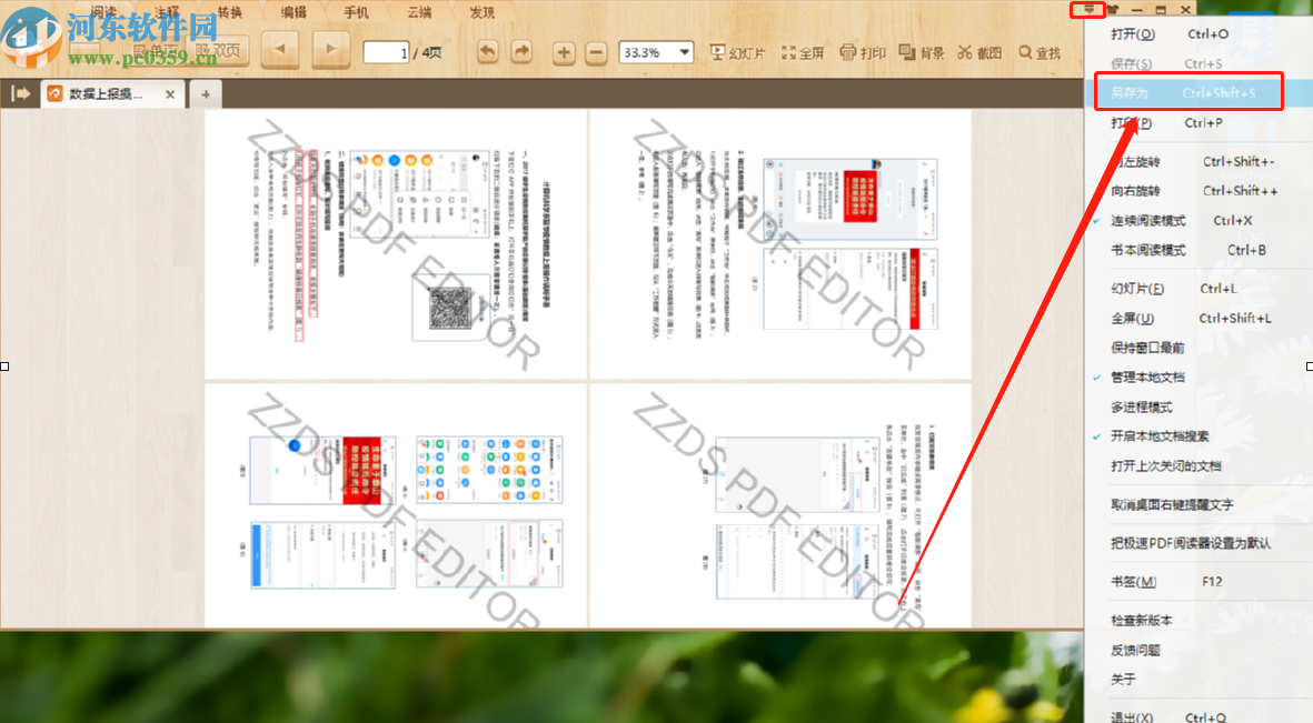 5.我们根据自己的需求旋转好PDF文件的页面之后,点击右上角的倒三角图标,然后在出现的选项中点击另存为选项。
