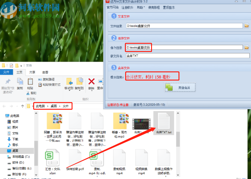 5.等到合并完成之后,界面中会显示合并结束提示,并告诉我们耗时多久,然后我们跟着保存目录的路径就可以找到合并之后的TXT文件了。