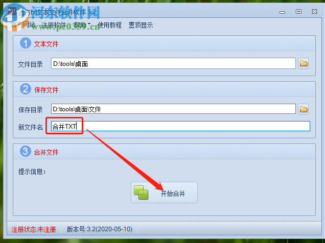 4.设置好合并文件的保存目录之后,我们在新文件名处输入合并文件的新名称,然后点击下方的开始合并按钮即可开始合并操作。