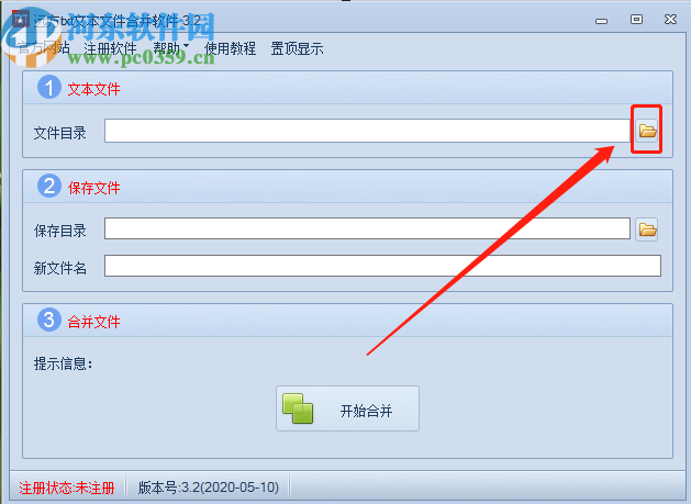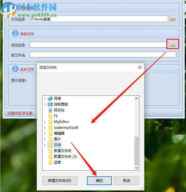 3.点击确定按钮选择好文件目录之后,下一步就是点击保存目录右边的文件夹图标,点击之后在打开的界面中可以选项文件合并之后的输出位置。