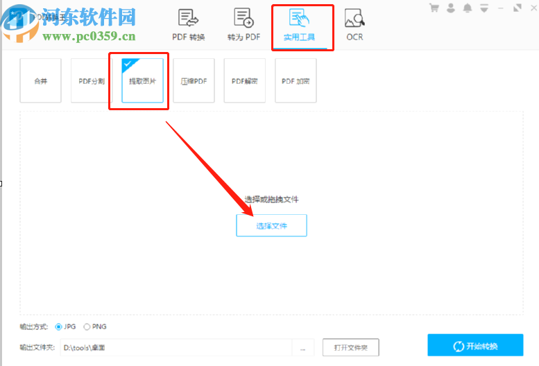 1.首先第一步我们打开软件之后点击实用工具模块,然后选择提取图片功能并点击选择文件按钮。