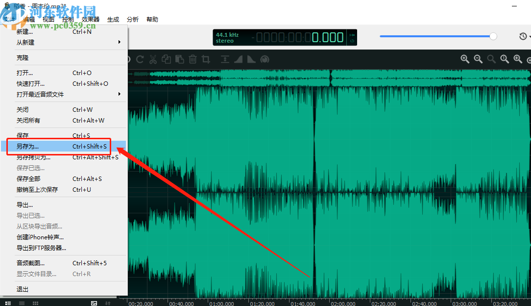 5.点击文件选项卡之后在出现的选项中点击另存为这个选项,可以将设置反向效果的音频给保存下来。