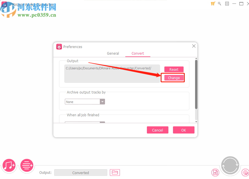4.切换到转换设置界面之后我们就可以看到输出选项设置了,接着点击Change这个改变按钮可以改变输出目录。