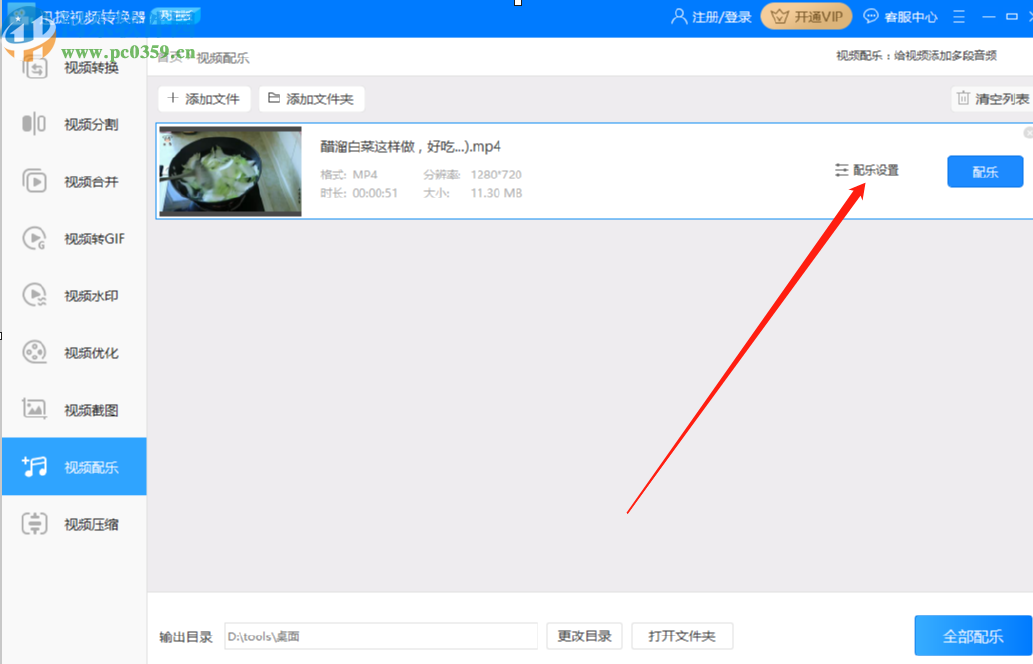 4.点击打开按钮之后下一步是在界面的视频列表中点击配乐设置这个功能选项,如下图中所示。