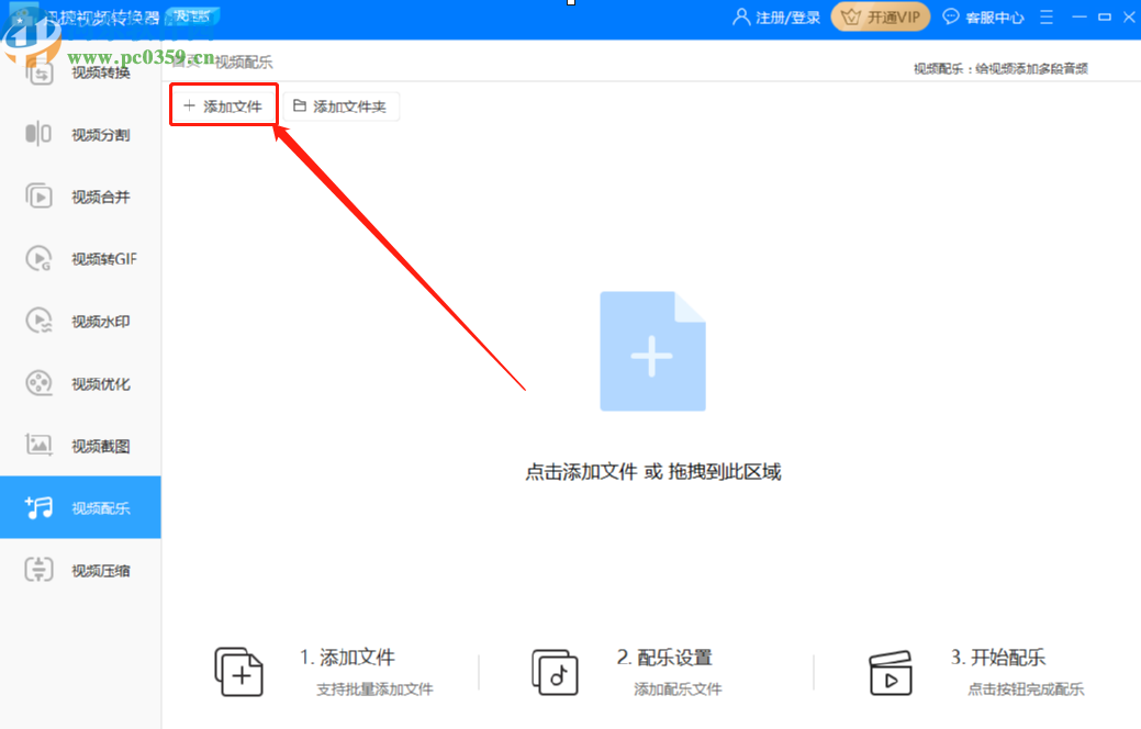 2.进入到给视频添加配乐的功能界面之后,我们在界面中点击添加文件按钮,然后选择想要添加配乐的视频加载到软件中。