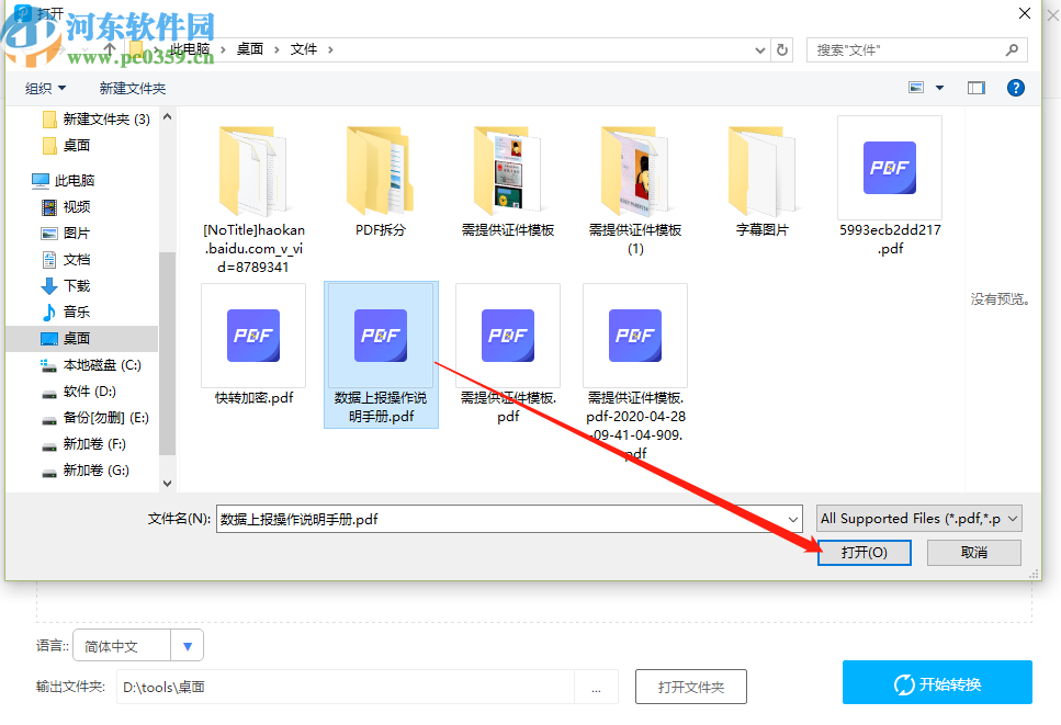 2.点击选择文件按钮之后会打开一个选择PDF文件的界面,在这个界面中我们选中目标PDF文件之后点击打开按钮。