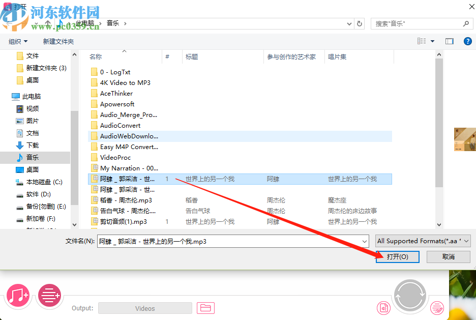 2.点击上一个步骤中说到的图标之后,我们在出现的选择文件界面中就可以选择目标音频文件了,选中之后点击右下角的打开按钮。