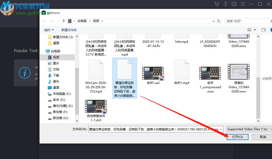 3.点击加号之后就打开了一个选择文件的界面,在这个界面中我们选中目标视频文件之后点击打开按钮即可。