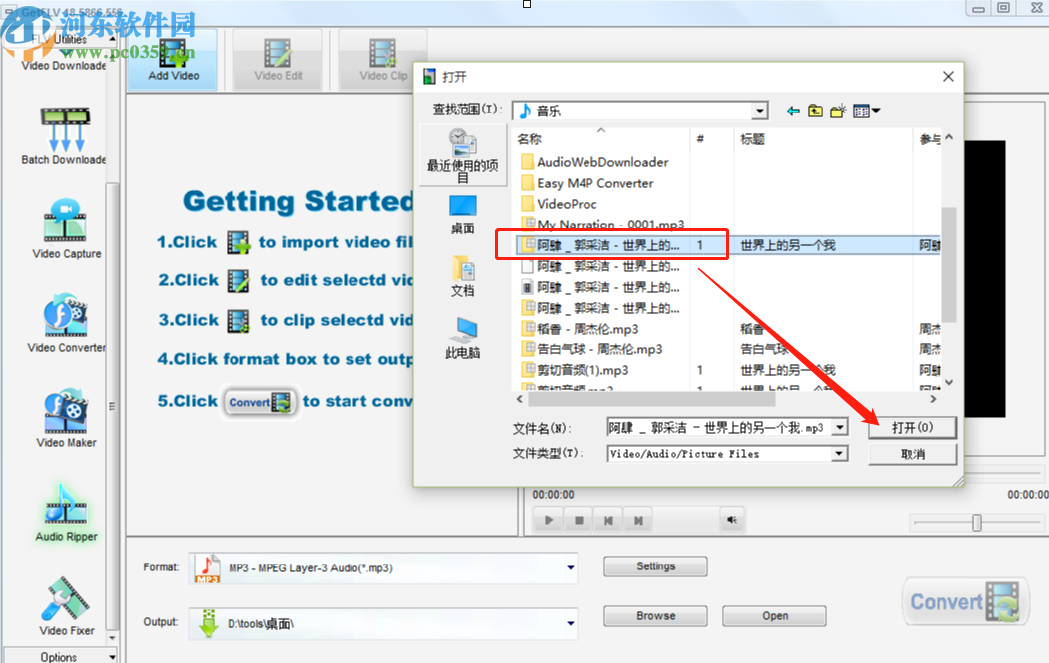 2.点击添加文件按钮之后下一步在出现的选择文件界面中选中想要剪切的音频文件之后,点击打开按钮进入下一步。