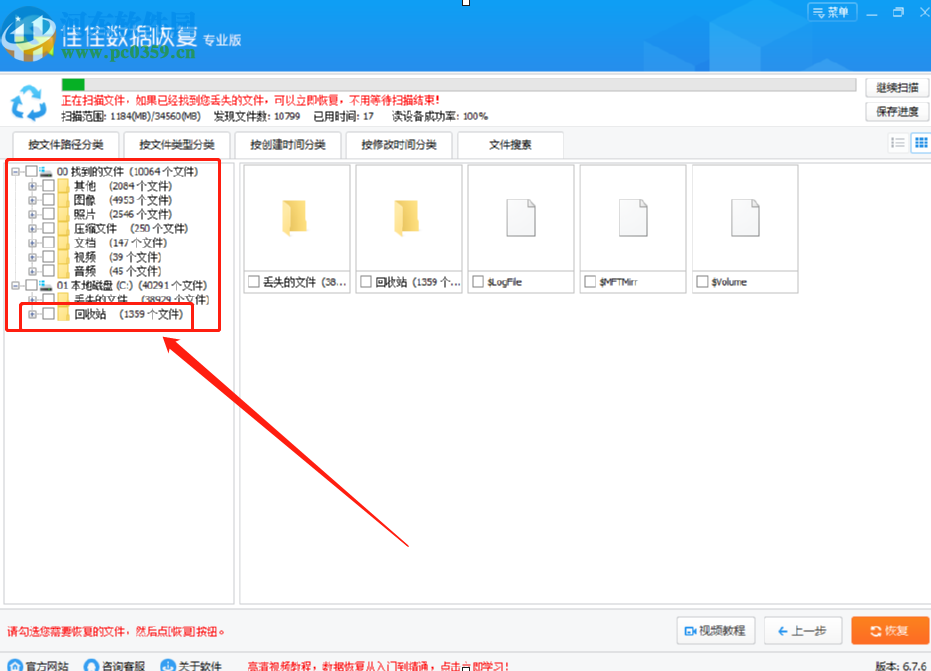 3.等到扫描操作完成之后我们在界面左边就可以看到扫描出来的文件列表了,然后我们在这些列表中可以看到有回收站选项,需要点击打开。