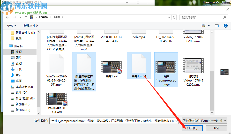 2.点击这个加号图标之后下一步在打开的界面中选择想要合并的视频文件,全部选中之后点击右下角的打开按钮即可。