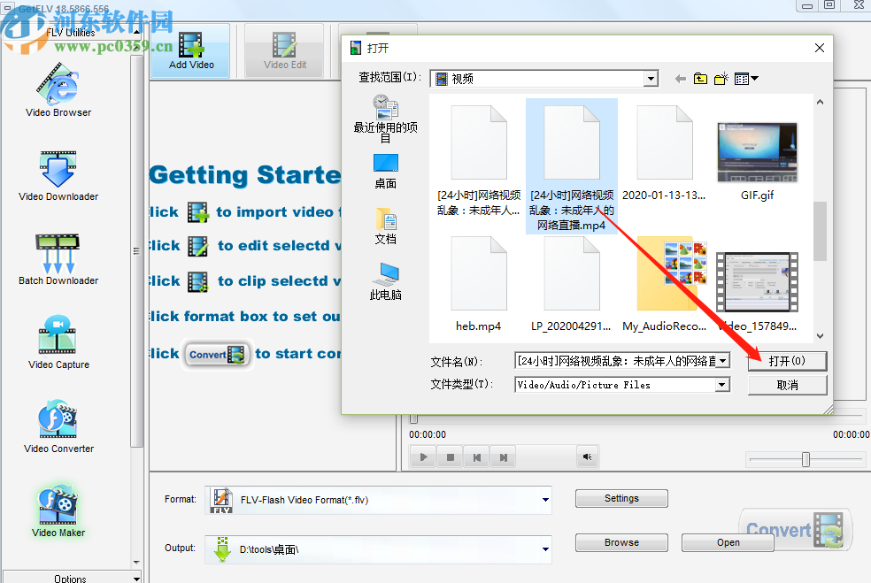 2.点击Add Video按钮之后就会打开一个选择文件的界面,在这个界面中我们选中想要添加水印的视频之后点击打开按钮。