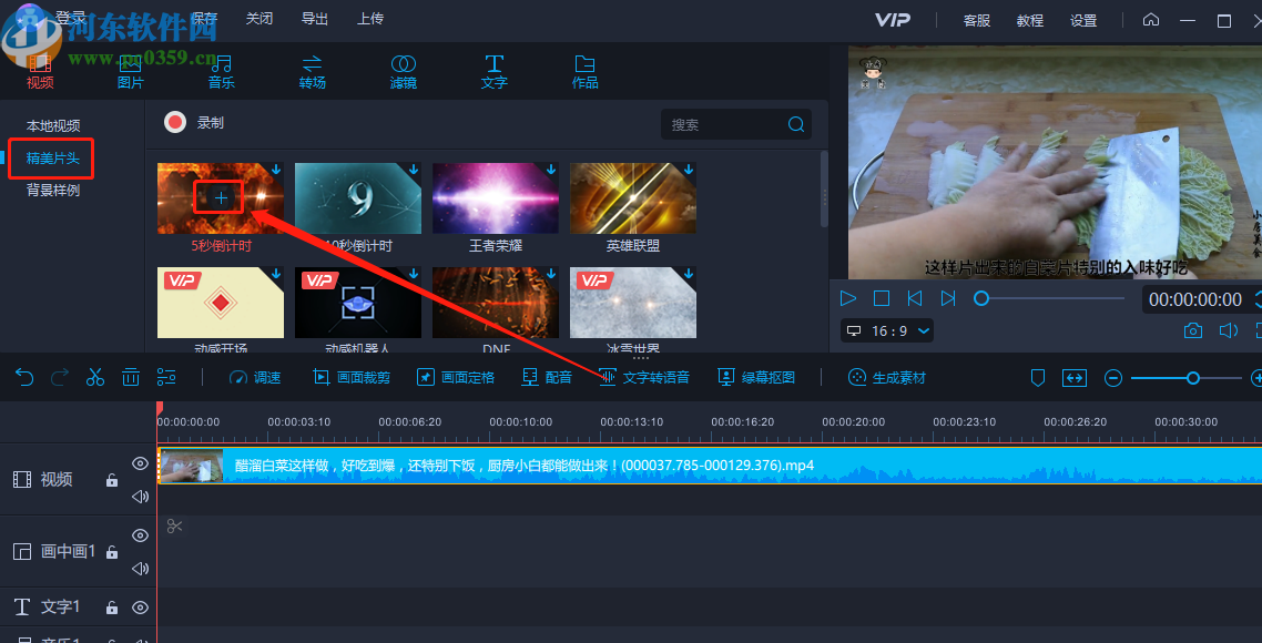 5.将视频添加到下方的操作轨道之后,我们在界面左上方选择精美片头选项,找到之后就可以看到倒计时的片头素材了,点击加号下载它并添加到下方的操作栏中。