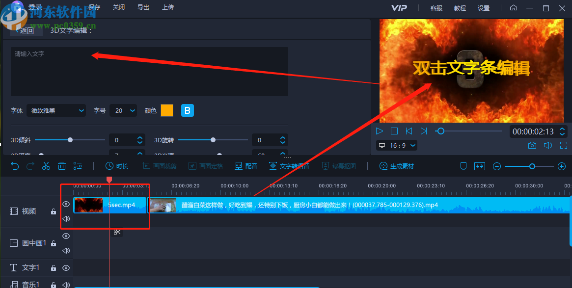 6.点击将片头添加到下方的操作轨道之后,根据提示双击右边的文字条,然后就可以对片头的文字进行编辑。
