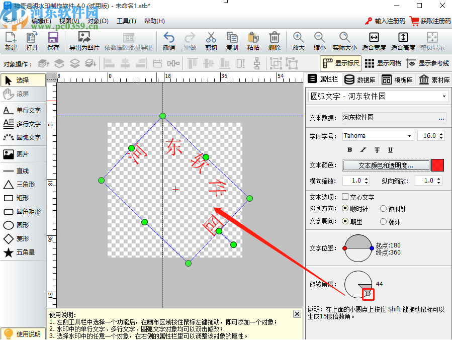 7.设置好文字位置之后,下一步可以对旋转的角度进行设置,拖动小圆点即可对旋转角度进行更改,这个更改是整个水印区域进行更改的。