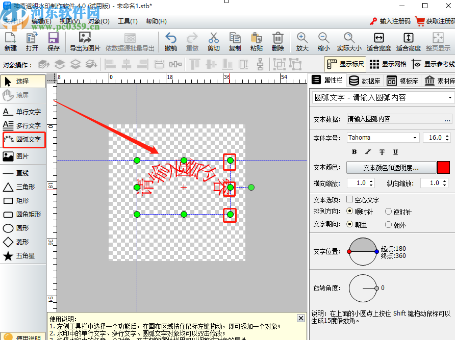 2.小编选择圆弧文字之后,点击界面中间的水印预览区域就会出现圆弧水印的模板了,我们点击绿色的小圆点拖动可以对水印位置、尺寸进行更改。