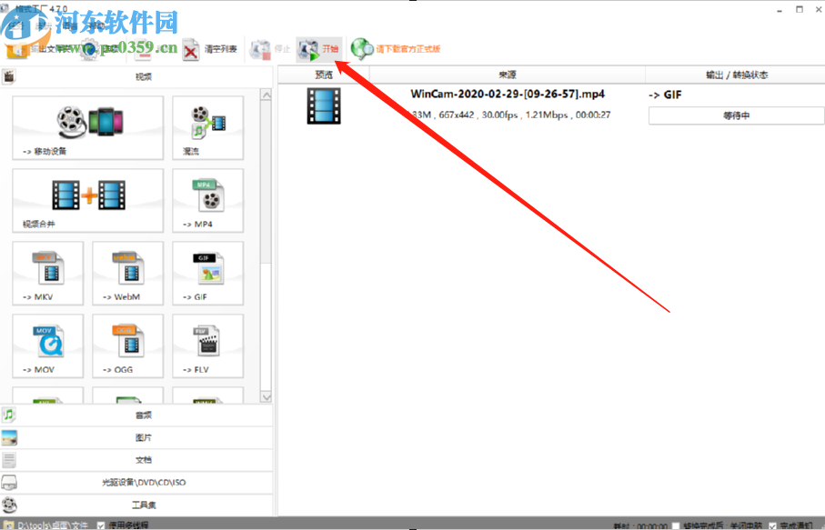7.最后回到软件的主界面,点击界面左上角的开始按钮就可以开始视频转gif的操作了。