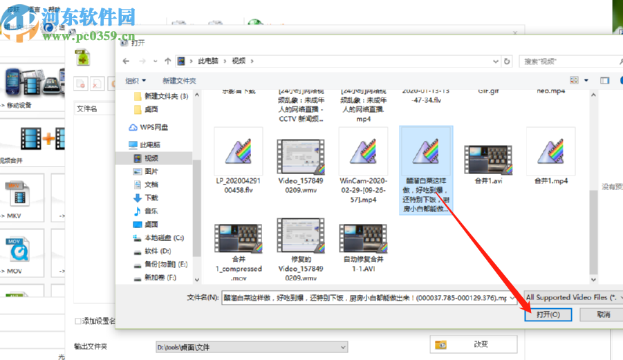 3.点击添加文件按钮之后在打开的选择文件界面中,选中目标视频文件之后点击右下角的打开按钮即可。