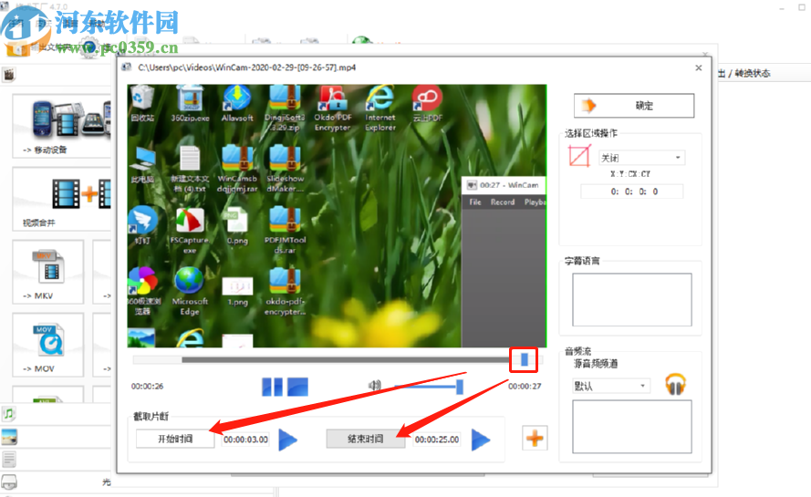 5.进入到剪辑视频的界面之后,移动视频进度条上的小图标,然后点击开始时间按钮和结束时间按钮即可选取剪辑的片段,选择完成点击右上角的确定。