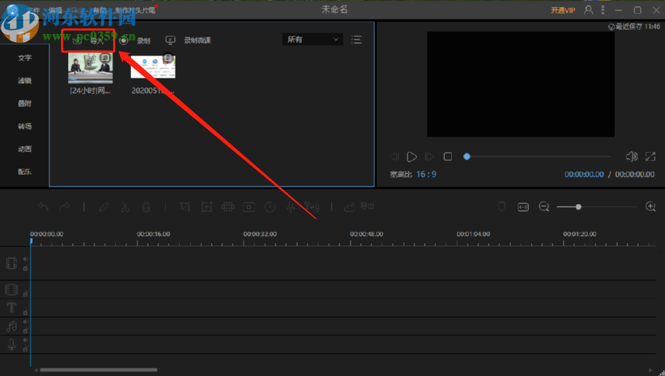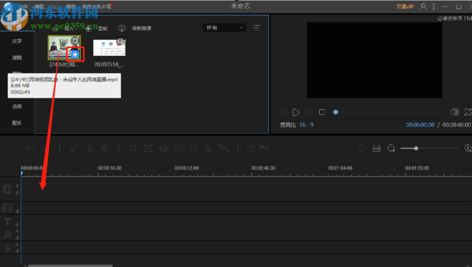 3.点击这个打开按钮之后,我们可以点击加号将视频添加到下方的轨道当中,也可以直接拖拽视频到下方的轨道。