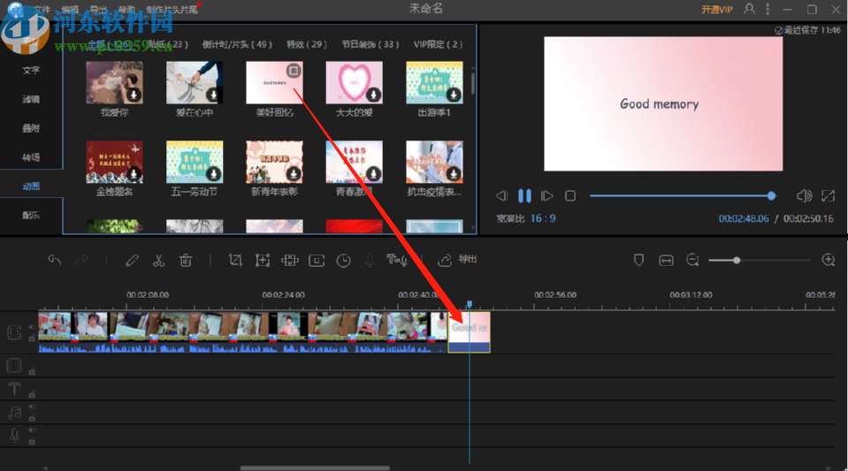5.动画下载完成之后,我们选中动画之后拖拽到下方的视频操作轨道中,然后就会自动衔接到视频的尾部。