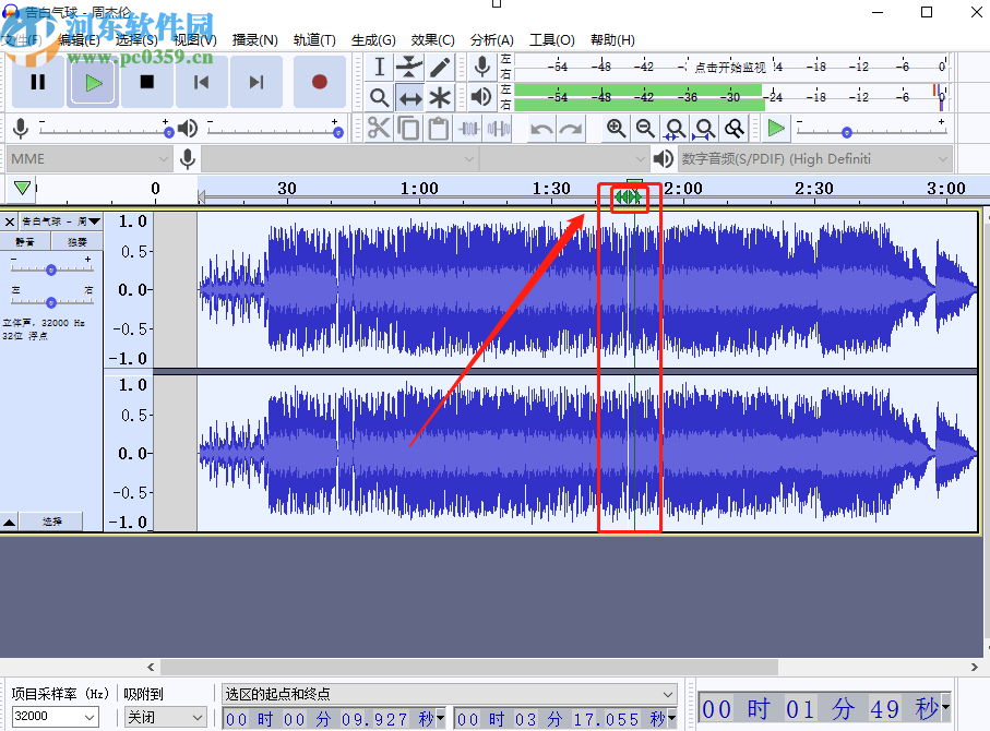 5.点击设置为定位播放之后,我们在音频轨道的位置移动鼠标就可以看到鼠标变成下图中框出的这个形态了,移动到哪里就会播放哪里。
