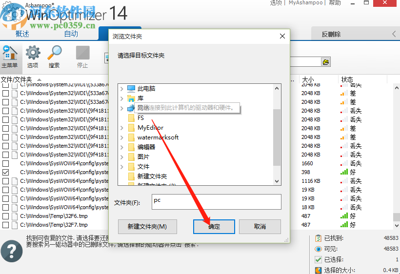 6.最后点击这个还原按钮会出现一个选择还原文件储存位置的界面,我们点击选择好储存位置并点击确定按钮即可还原该文件。