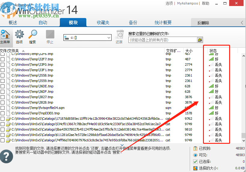 4.点击开始搜索之后,等待搜索完成,我们在界面中可以看到文件列表,他们的状态一栏会显示文件已经丢失或者完好。