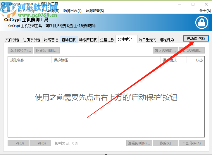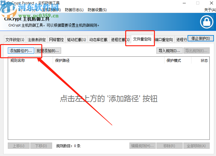 2.点击启动保护之后,我们选择文件重定向模块,然后点击界面中的添加路径按钮,如下图中所示。