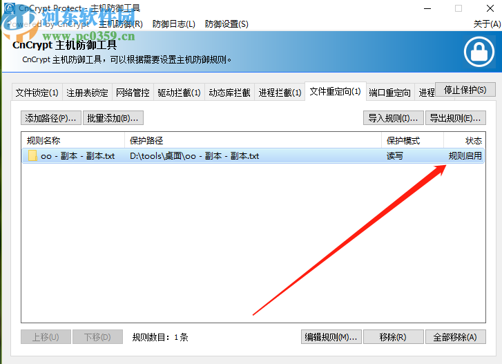 7.点击确定按钮之后,我们在界面中间就可以看到刚刚创建好的这个文件重定向任务了,后面状态显示为启用表示重定向已生效。