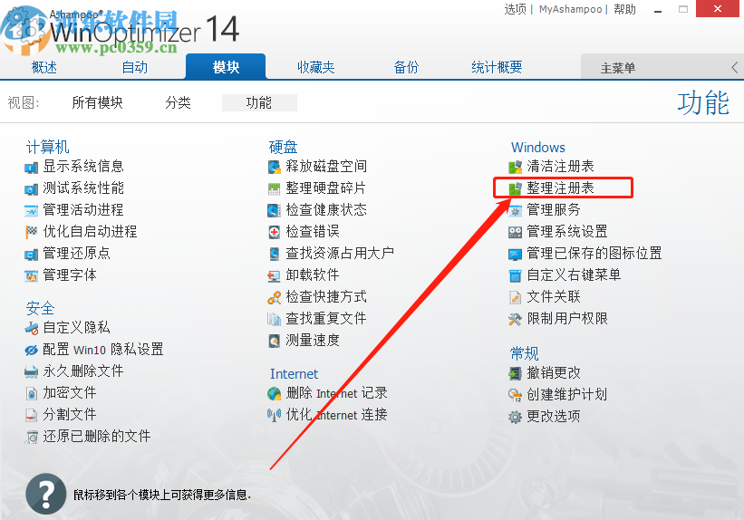 2.点击切换到模块界面之后,我们找到整理注册表这个功能选项,然后点击进入到其中。