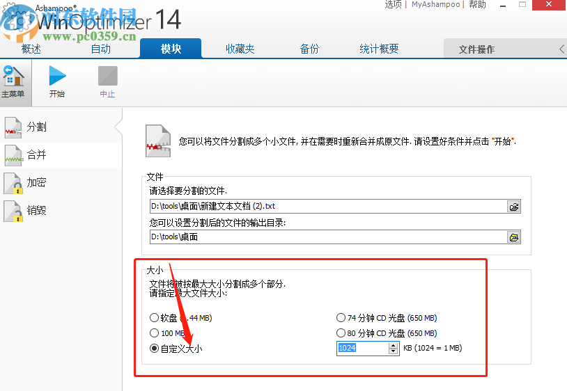 5.点击确定按钮之后,下一步在下方的大小位置,选择想要分割的大小方式,还可以选择自定义大小。