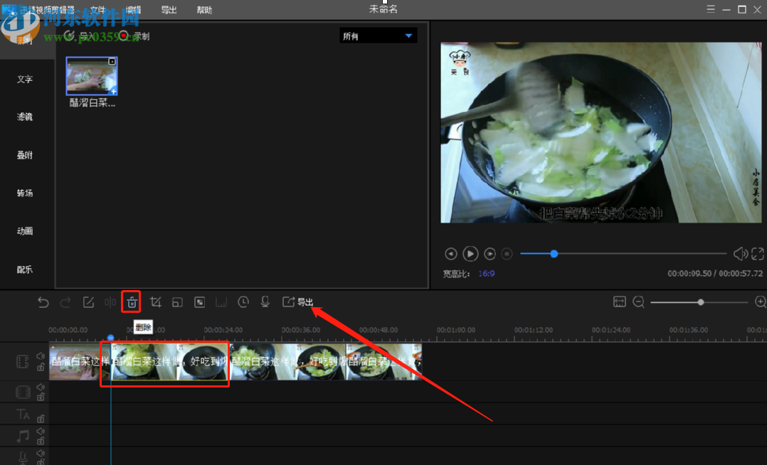 6.点击这个分割按钮将视频按照自己的需求分割之后,点击选中其中一段视频可以点击删除图标进行删除,设置完成之后点击导出按钮。