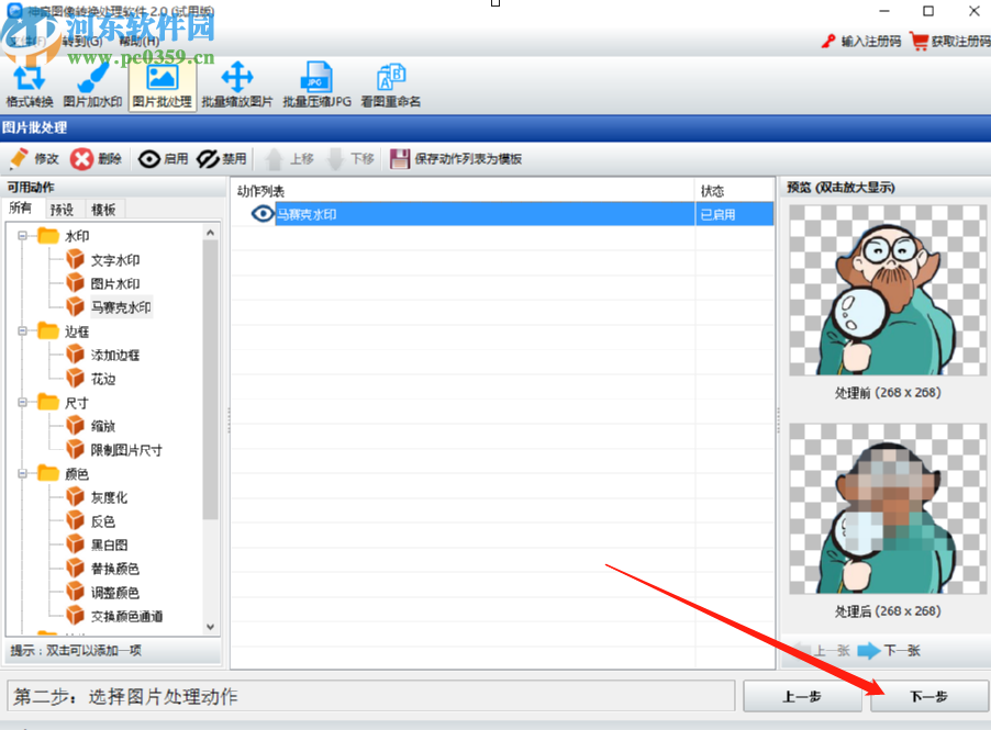 4.点击下一步按钮之后,我们进入到编辑图片的功能界面,然后在界面中选中马赛克水印功能并双击,双击之后在出现的选择文件界面中可以设置马赛克水印的宽度和高度等参数。
